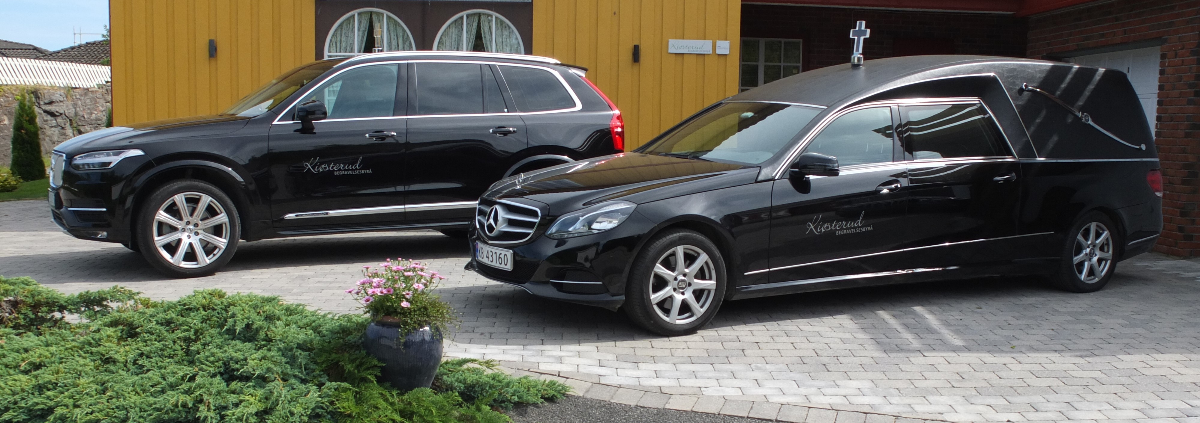 I vårt byrå har vi to bårebiler: En Mercedes E-klasse spesialbil som hovedsaklig benyttes til seremonier og kortesjekjøring og en Volvo XC-90 med egnet innredning som oftest benyttes til bårehenting og transport av kister. Dette er biler som kombinerer verdighet og bruksegenskaper på en særdeles god måte.